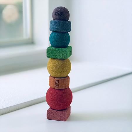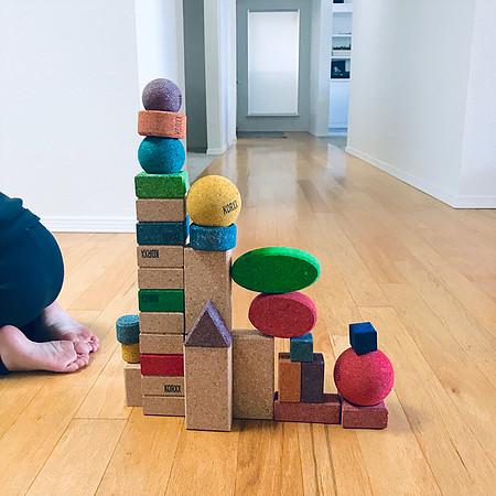 Like your traditional wood blocks, Korxx can be used to build structures. However, unlike traditional wood blocks, there is more friction which makes balancing round shapes on top of other round shapes a whole lot more exciting. And because they are soft and lightweight, I'm not worried about my wood floor being damaged when they fall.