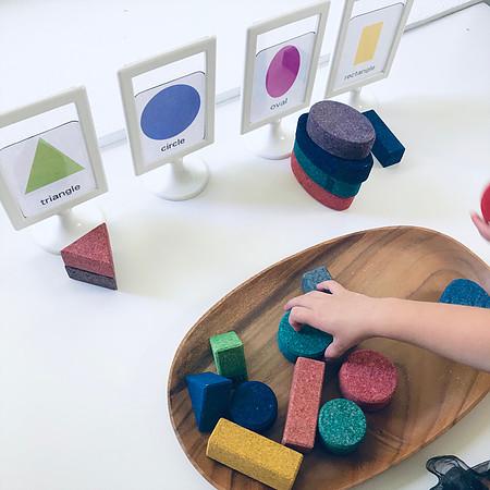 Because they float, you get all the benefits of traditional wood blocks AND some extra science benefits. They make the perfect little blocks for a water sensory table, exploring sinking and floating (science), and even working on balancing (engineering). They are also great for creating two dimensional and three dimensional creations (art & engineering), but when those tall towers inevitably fall, you won’t hardly hear a thing. And let’s not forget about all the math concepts blocks help build: shape recognition, part and whole, big and small, and patterns. Talk about some serious critical thinking stimulation.