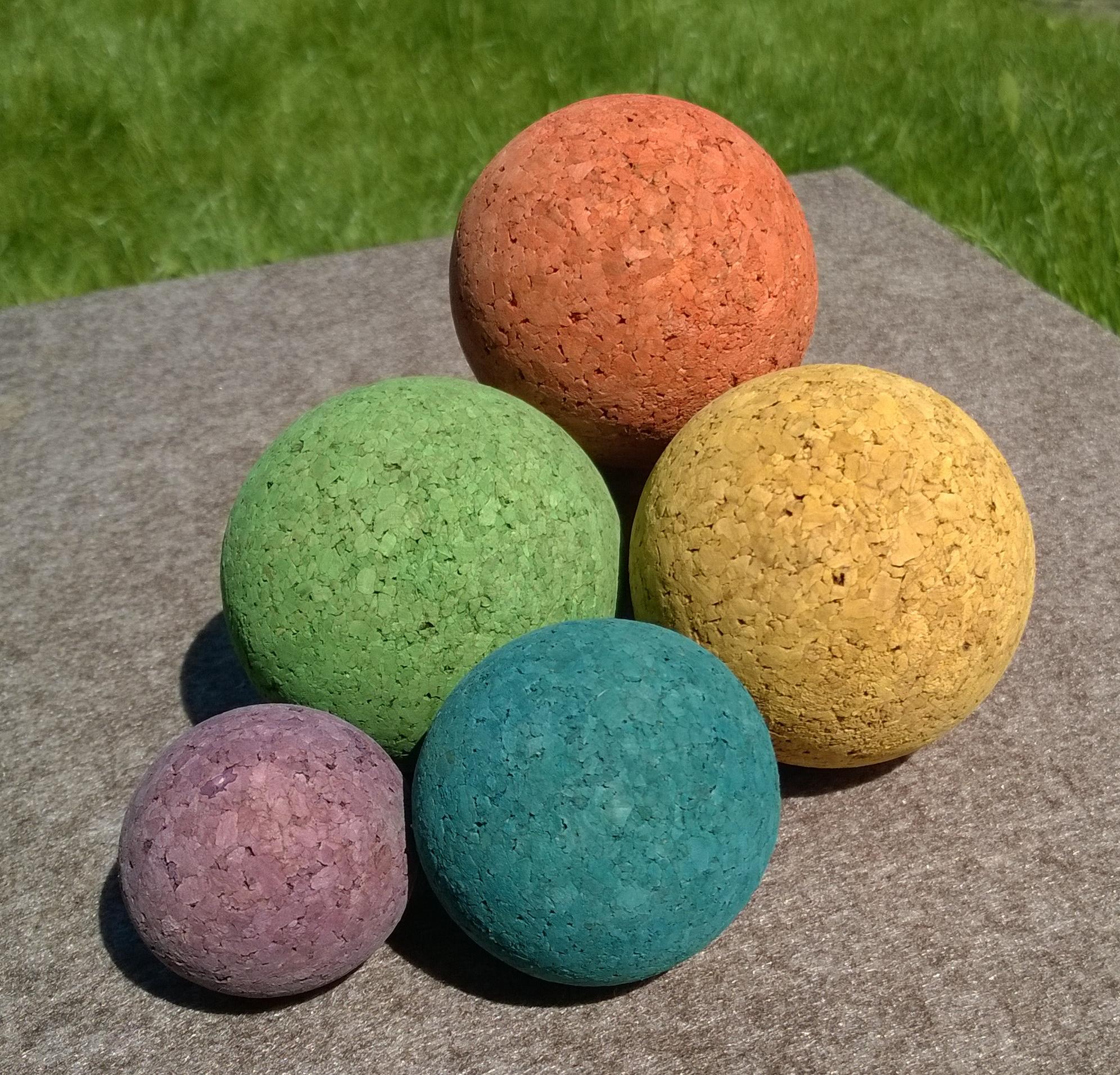 5 coloured spheres in diffent sizes.