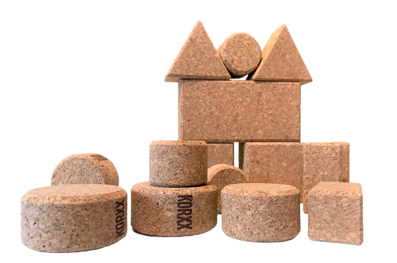Leicht, weich, leise und stabil: Das sind die minimalistischen Bauklötze von KORXX. Sie bestehen zu 100% aus gepresstem Korkgranulat, das aus nachwachsenden Hölzern in einer nachhaltigen Waldwirtschaft produziert wird. Durch die besondere Oberfläche haften die Klötze hervorragend aneinander und ermöglichen so stabile Konstruktionen ohne Verrutschen. Das freie Kreieren von Strukturen fördert Kreativität und Vorstellungsvermögen und schafft Selbstvertrauen durch positive Erfolgserlebnisse. Die KORXX-Bauklötze sind anti-allergen und bergen aufgrund ihres Gewichtes ein geringeres Verletzungsrisiko, so dass bereits kleinste Kinder ab dem zweiten Lebensjahr mit ihnen spielen können.