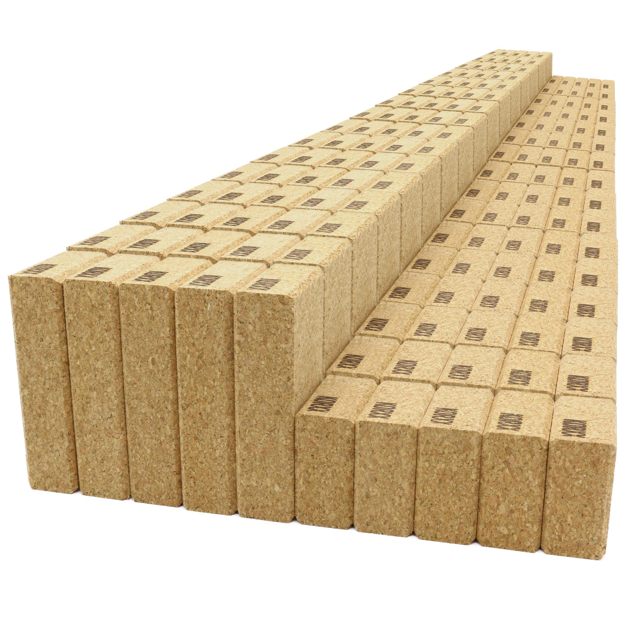 Das Cuboid XL-Set beinhaltet 140 eckige Korkbauklötze. Die Bauklötze besitzen abgeschrägte Kanten und geschliffene Oberflächen und sind für Kinder ab einem Jahr geeignet.