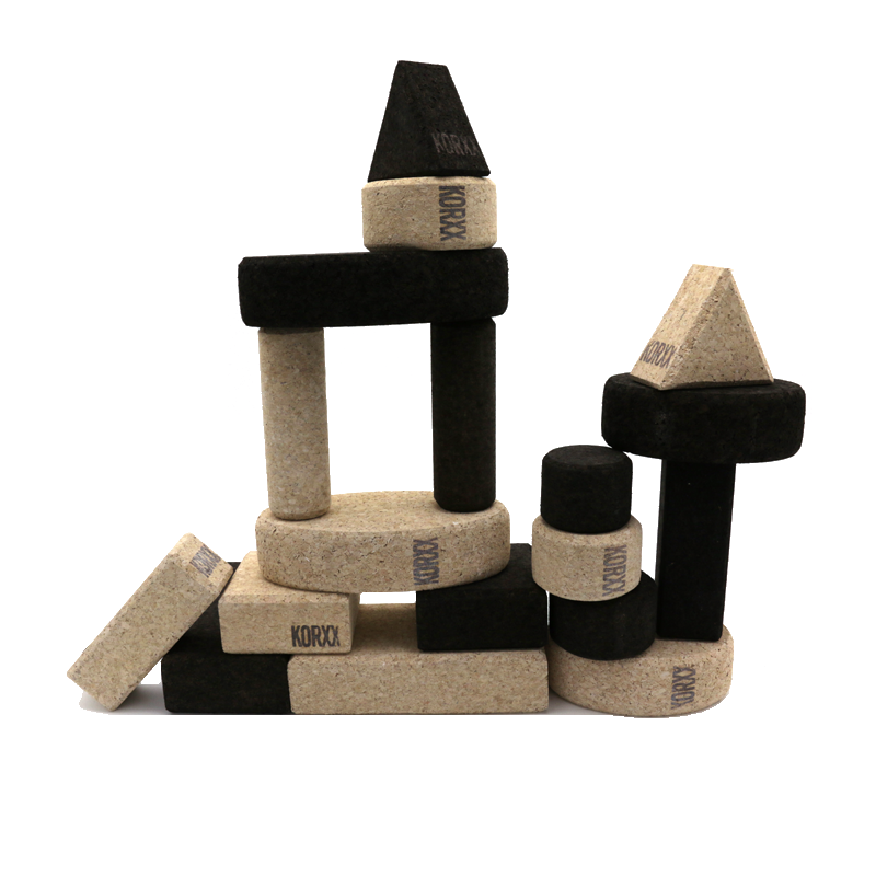 Leicht, weich, leise und stabil: Das sind die minimalistischen Bauklötze von KORXX. Sie bestehen zu 100% aus gepresstem Korkgranulat, das aus nachwachsenden Hölzern in einer nachhaltigen Waldwirtschaft produziert wird. Durch die besondere Oberfläche haften die Klötze hervorragend aneinander und ermöglichen so stabile Konstruktionen ohne Verrutschen. Das freie Kreieren von Strukturen fördert Kreativität und Vorstellungsvermögen und schafft Selbstvertrauen durch positive Erfolgserlebnisse. Die KORXX-Bauklötze sind anti-allergen und bergen aufgrund ihres Gewichtes ein geringeres Verletzungsrisiko, so dass bereits kleinste Kinder ab dem zweiten Lebensjahr mit ihnen spielen können.